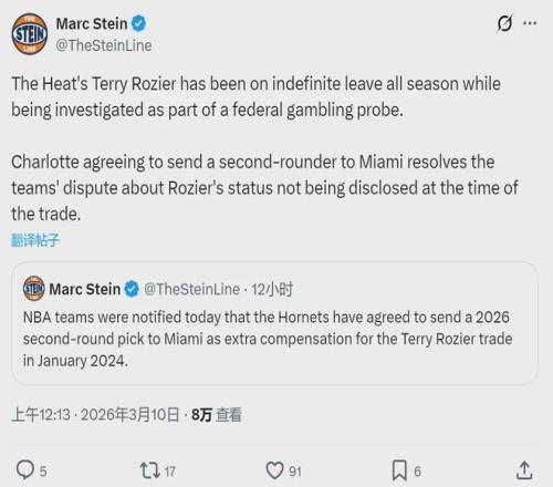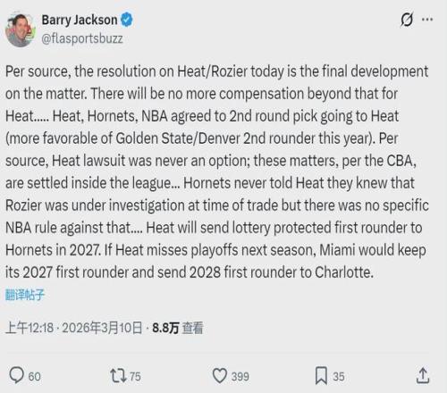 北京時間3月10日,據(jù)NBA名記Shams和Marc Stein報道,NBA聯(lián)盟的各支球隊今天接到一個通知,黃蜂隊已經(jīng)同意將2026年次輪簽送給熱火,作為羅齊爾的交易補償。這個次輪簽是掘金和勇士順位更高的那個,目前預(yù)計是勇士的次輪中段。