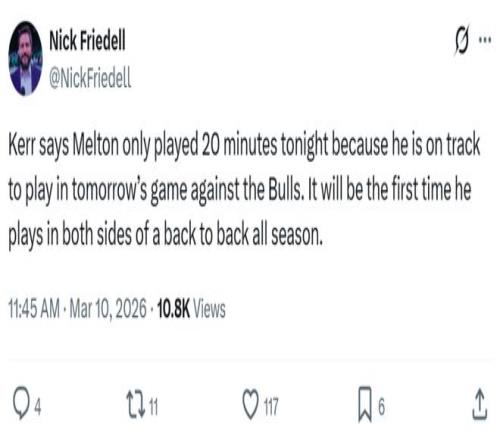 其中梅爾頓與小庫里值得稱贊,前者全場僅出戰(zhàn)19分56秒就拿下全隊最高22分,之所以出戰(zhàn)時間這么短,科爾賽后給出的理由是下一場背靠背他也將出戰(zhàn)。