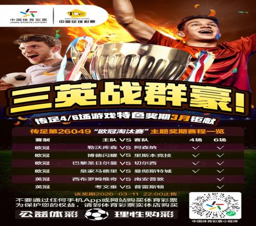 第26049期傳足4/6場游戲特色獎期已經(jīng)于2026年3月8日20:00開售,將于2026年3月11日22:00停售,并于2026年3月12日開獎,其中勒沃庫森VS阿森納、博德閃耀VS里斯本競技、巴黎圣日爾曼VS切爾西、皇家馬德里VS曼徹斯特城為4場進球游戲競猜賽事。