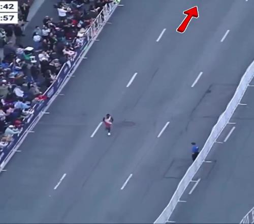 沿沖刺賽道奔跑時,一名揮舞肯尼亞國旗的女子突然沖到他身前,迫使他向右側避讓。
