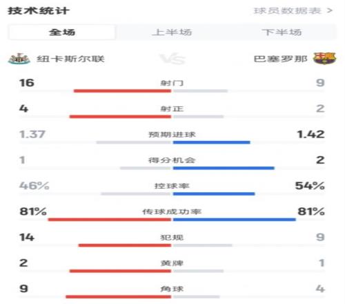紐卡11巴薩全場數據:射門169,射正42,控球率46%54%