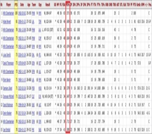 他的命中率46.5%,是歷史單場70+里是最低的,此前是張伯倫的50%。