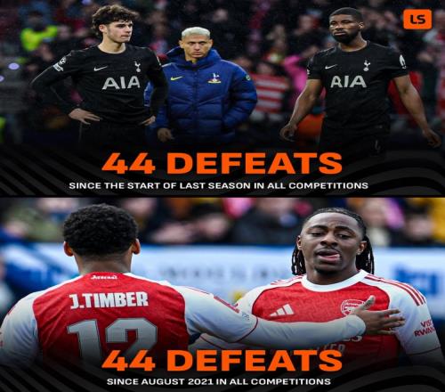 據LiveScore統(tǒng)計,上賽季以來熱刺各賽事輸掉44場比賽,與阿森納近5個賽季(2021年8月份以來)輸掉的比賽場次相同。