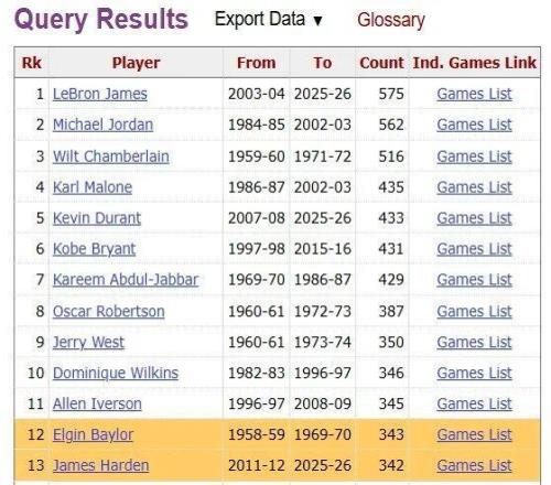 這也是老登常規賽生涯第343場30+,追平埃爾金·貝勒升至歷史第12位。