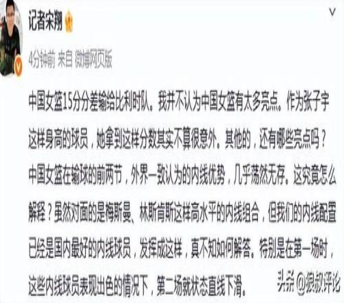 中國女籃15分分差輸給比利時隊。我并不認為中國女籃有太多亮點。作為張子宇這樣身高的球員,她拿到這樣分數其實不算很意外。其他的,還有哪些亮點嗎?中國女籃在輸球的前兩節,外界一致認為的內線優勢,幾乎蕩然無存。這究竟怎么解釋?