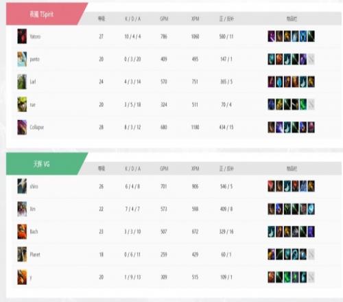 首局比賽前期雙方發育較為平穩,中期VG先行發力,借助Bach瑪爾斯連續框出好大強殺Yatoro影魔!一度帶盾拿下了局面的主動權,但Collapse滾滾關鍵魔晶團發力,殘局越戰越勇一波三殺幫助Spirit四換五團滅VG,可以把局面往后拖!比賽進入后期Xm火槍輸出受限,Spirit則是借助影魔小小先手+panto小娜迦大招贏下團戰,最終shiro斯溫被Yatoro雙倍影魔貼臉搖大強殺沒有買活,VG先輸一局!