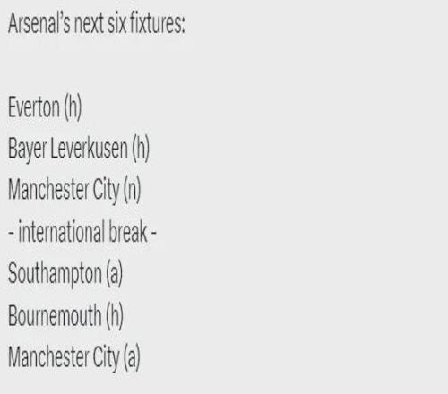 阿森納未來6場比賽:主戰埃弗頓、主戰勒沃庫森、聯賽杯決賽對曼城、國際比賽日、客戰南安普頓、主戰伯恩茅斯、客戰曼城。
