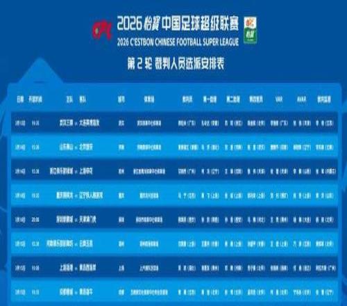 閃電體育3月13報道今日,中超第2輪裁判安排出爐,麥麥提江主哨焦點大戰山東泰山vs北京國安,VAR唐順齊,本場比賽將于3月14日周六15:30進行。