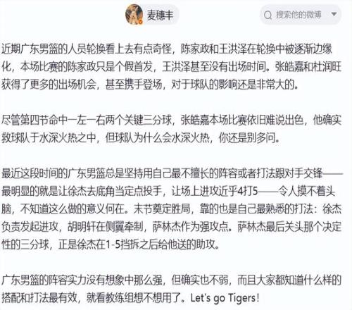 賽后,媒體人“麥穗豐”發文替陳家政、王洪澤打抱不平,并質疑杜鋒:陳家政和王洪澤在輪換中被逐漸邊緣化,本場比賽的陳家政只是個假首發,王洪澤甚至沒有出場時間。張皓嘉和杜潤旺獲得了更多的出場機會,甚至攜手登場,對于球隊的影響還是非常大的。最近這段時間的廣東男籃總是堅持用自己最不擅長的陣容或者打法跟對手交鋒——最明顯的就是讓徐杰去底角當定點投手,讓場上進攻近乎4打5——令人摸不著頭腦,不知道這么做的意義何在。