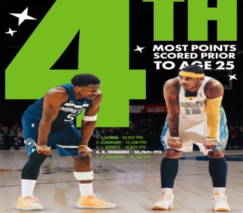 愛德華茲25歲前的總得分超越卡梅隆·安東尼,上升至NBA歷史第四,僅次于詹姆斯、杜蘭特和東契奇。