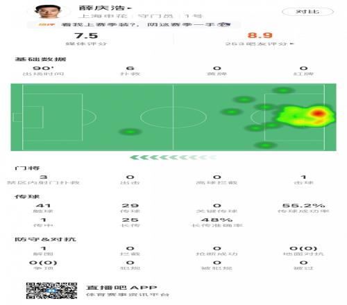 高接抵擋,薛慶浩全場數據:1擊球1解圍6撲救,獲評7.5分
