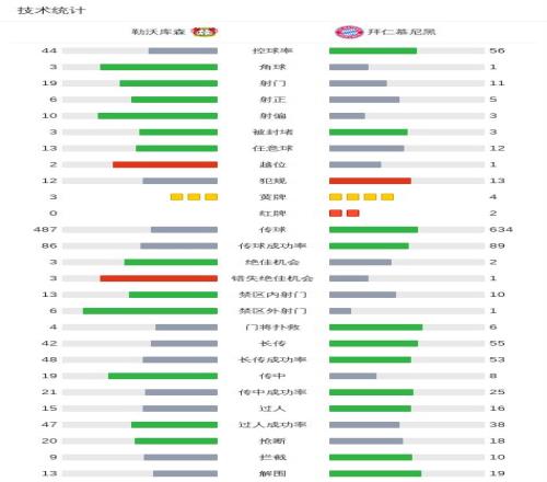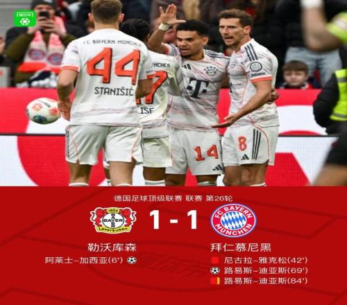 北京時間3月14日德國足球頂級聯賽第26輪,勒沃庫森主場對陣拜仁慕尼黑。上半場,希克助攻加西亞爆射破門,約納坦-塔被動破門因手球犯規進球無效,雅克松飛鏟泰里耶腳踝被直紅罰下;下半場,凱恩逼搶門將后破門被判手球犯規進球無效,奧利塞斷球助攻迪亞斯推射扳平,迪亞斯被判假摔兩黃變一紅,霍夫曼破門被判越位進球無效。最終比分勒沃庫森 1-1 拜仁。