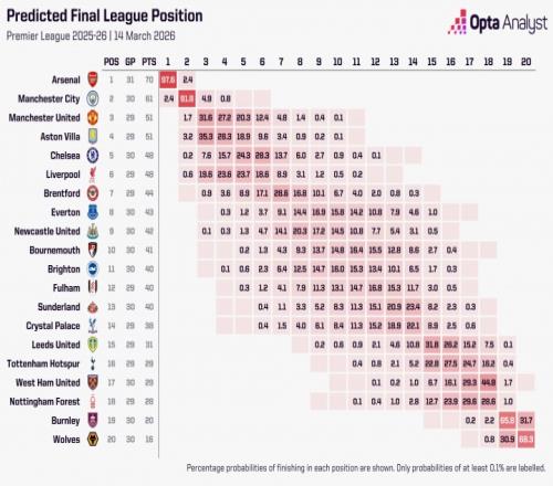 據OPTA利用超級計算機進行的10000次模擬,阿森納奪得英超冠軍的概率為97.6%,曼城奪冠概率為2.4%。