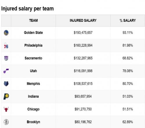 在傷員薪水絕對值和占比上排名第二的都是76人,他們傷員工資1.6億美元&占全隊薪水81.98%;絕對值第三是國王,占比第三則是灰熊。