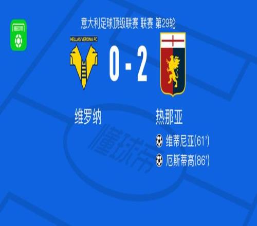 北京時間3月15日意大利足球頂級聯賽第29輪,維羅納主場迎戰熱那亞。比賽中,熱那亞球員維蒂尼亞率先破門,隨后阿龍-馬丁助攻厄斯蒂高再下一城。最終,維羅納0-2不敵熱那亞。