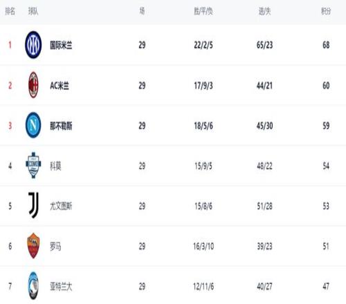 在積分榜上,國際米蘭以68分占據榜首位置,戰績是22勝2平5負。這一輪國際米蘭被亞特蘭大逼平。本來是身后的AC米蘭追分的好機會。沒想到AC米蘭爆冷落敗,導致與國際米蘭的差距變大了。AC米蘭60分,落后8分!那不勒斯以59分排名第3。法布雷加斯率領科莫這匹大黑馬擊敗羅馬之后,殺入歐冠區,排名第4。尤文圖斯53分,嗲到第5名。羅馬掉隊了,51分排名第6。