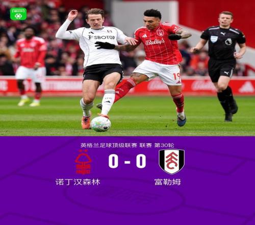 北京時間3月15日22:00,英超第30輪,諾丁漢森林主場對陣富勒姆。上半場雙方均無建樹,下半場,恩多耶進球被吹越位,埃納爆射擊中門框。最終諾丁漢森林0-0戰平富勒姆。