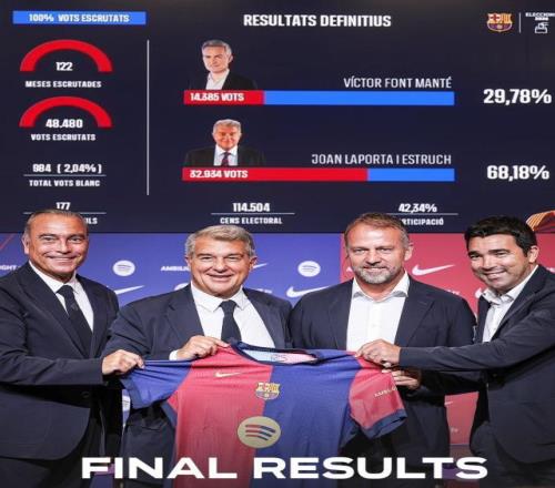 拉波爾塔最終以壓倒性優勢贏得巴薩主席選舉。在約4.8萬名會員參與的投票中,拉波爾塔斬獲超過68%的選票,較2021年首次當選時的54%大幅提升。在選票核驗進度尚不足3/4時,競爭對手豐特便已公開承認敗選。