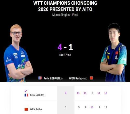 WTT冠軍賽重慶站男單決賽,世界排名第27位的19歲中國選手溫瑞博,對陣世界排名第6的法國選手小勒布倫。最終溫瑞博1比4不敵小勒布倫,獲得本站亞軍,而在女單決賽中蒯曼3比4不敵張本美和,國乒男女單均無緣冠軍。各局比分分別為:11比5、11比8、9比11、11比7、13比11(小勒布倫在前)WTT冠軍賽重慶站比賽,19歲的溫瑞博持外卡出戰,接連淘汰莫雷加德、邱黨和張本智和闖入決賽,其中4比2淘汰張本智和的半決賽中,溫瑞博最后一局挽救5個局點,在最后時刻18比19落后的情況下,連拿3分殺死比賽。