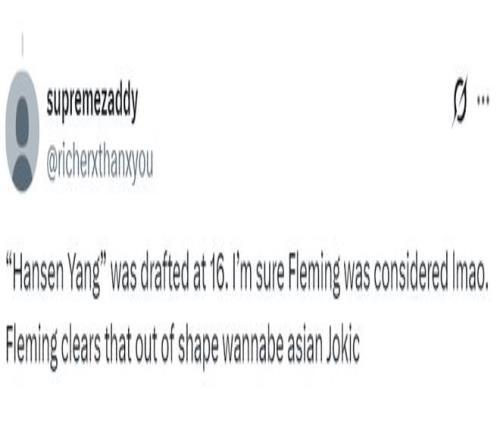 美球迷:楊瀚森第16順位就被選中了,但我相信太陽的弗萊明一定覺得很滑稽,楊瀚森只是一個空有中國約基奇名頭的糟糕家伙。