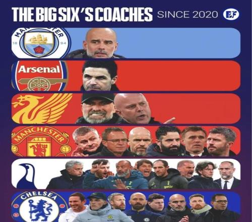 最近有媒體整理了英超六大豪門自2020年以來的主教練榜單。放在同一張圖里看,反差確實很明顯:曼城和阿森納這邊,名單幾乎沒怎么變,利物浦也只是完成了一次交接;曼聯、熱刺和切爾西這邊,主教練名字卻越排越長。同樣都是豪門,為什么有的球隊多年都能穩住帥位,有的球隊卻總在不斷換人?
