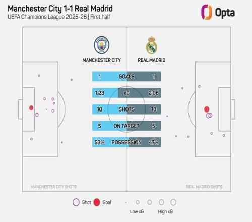 根據Opta的統計,本場比賽前45分鐘皇馬10次射門5次射正,預期進球數達到了2.06球,這是自2013-14賽季開始進行相關統計以來,皇馬在歐冠淘汰賽單場比賽中最高的上半場預期進球數。