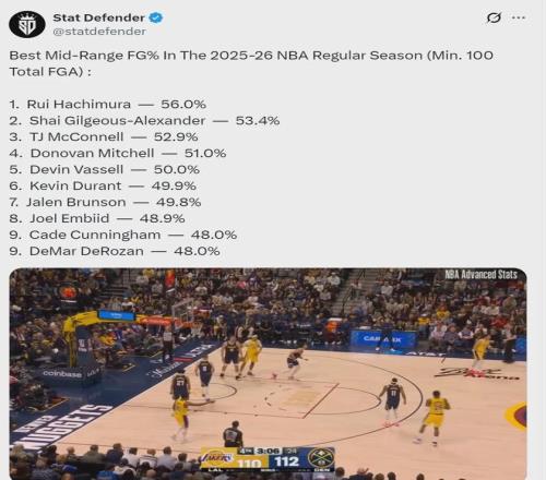 亞歷山大連續(xù)129場(chǎng)砍下20+,繼續(xù)刷新自己創(chuàng)造的NBA歷史紀(jì)錄。以雷霆的戰(zhàn)績(jī)還有亞歷山大的數(shù)據(jù),他要蟬聯(lián)常規(guī)賽MVP了。再看一組數(shù)據(jù),本賽季中距離跳投命中率,亞歷山大53.4%排名聯(lián)盟第二,僅次于八村塁(56%)。