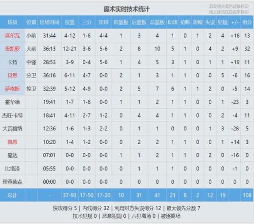 魔術(shù)狀元班凱羅打了36分鐘,投籃21中12,三分6中3,罰球6中5,砍下32分10籃板5助攻1搶斷4失誤,正負(fù)值+9。第四節(jié)班凱羅獨(dú)得15分,依然無(wú)力回天。貝恩11投6中,拿到16分3籃板。霍二叔的兒子杰特-霍華德7中1僅得3分!