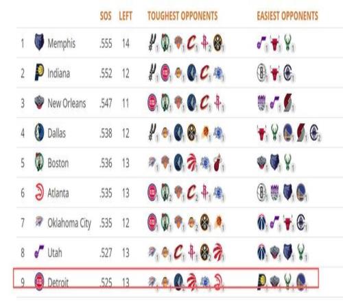 只不過,活塞剩余賽程難度高居聯盟第九,在本場贏下魚腩奇才后,對于這支黑馬的考驗才剛剛開始。