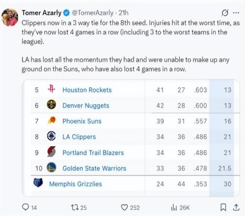 快船記者Tomer Azarly稱,快船目前的戰績跟開拓者、勇士很接近,但傷病找上了他們,目前他們正值一波四連敗還連續輸給聯盟最弱的球隊。快船已經失去了之前所擁有的全部優勢,并且已經無法跟太陽去競爭西部第七,就算太陽也是四連敗可跟快船的勝場差也有5個之多。