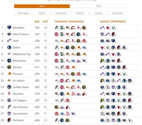 不過快船還手握一個優勢,那就是快船余下的賽程是聯盟第五優質的,對手的平均勝率僅為45.7%,還剩三場季后賽內的球隊:雷霆、馬刺、猛龍。