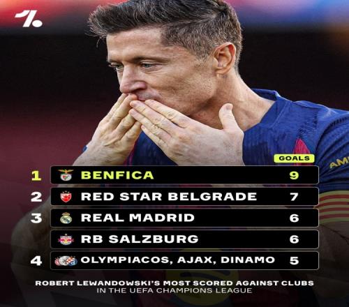 體育播報(bào)3月19日宣 今日,足球媒體OneFootball列出了被萊萬多夫斯基在歐冠賽場上進(jìn)球最多的俱樂部,其中面對本菲卡他的進(jìn)球數(shù)最多,共9次轟開對方大門。