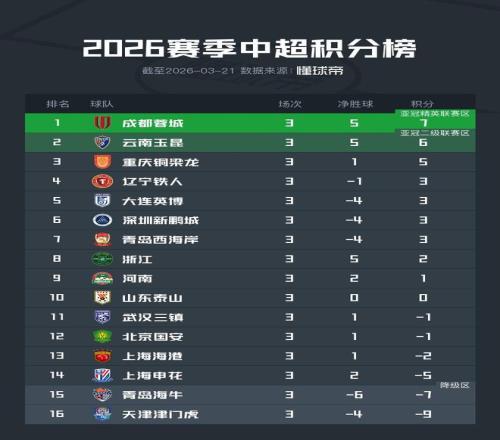 中超第3輪戰(zhàn)罷,成都蓉城在一場蕩氣回腸的川渝德比中3-3絕平銅梁龍,繼續(xù)積7分領跑。云南玉昆4-0完勝山東泰山,積6分升至第二,銅梁龍積5分排名第三。