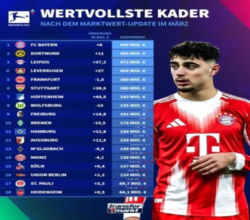 1. 拜仁慕尼黑:目前身價9.66億歐,本次更新上升600萬歐