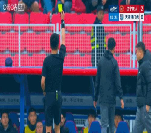 第83分鐘,津門虎教練組吃到一張黃牌↓
