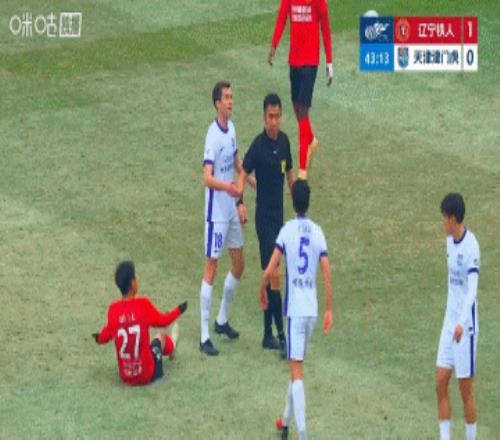 第17分鐘,鐵人前場左側定位球開到門前,費利佩頭球攻門被齊雨熙神撲化解,姆本扎想補射但倒地同時皮球被楊帆解圍,主裁沒有表示↓