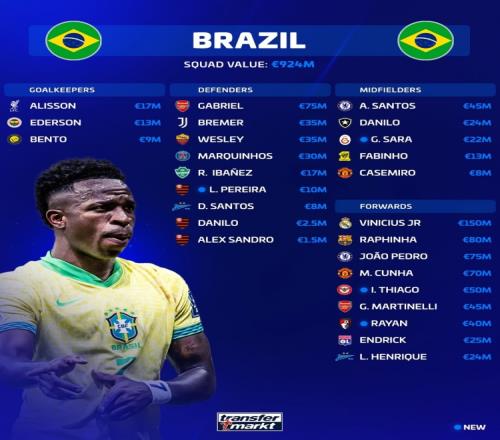 體育播報3月20日宣 巴西公布了最新一期國家隊大名單,德轉(zhuǎn)市場羅列本期巴西國家隊球員的身價。其中皇馬前鋒維尼修斯以1.5億歐元身價斷層領(lǐng)跑榜單,巴薩前鋒拉菲尼亞以8000萬歐元排名第二。