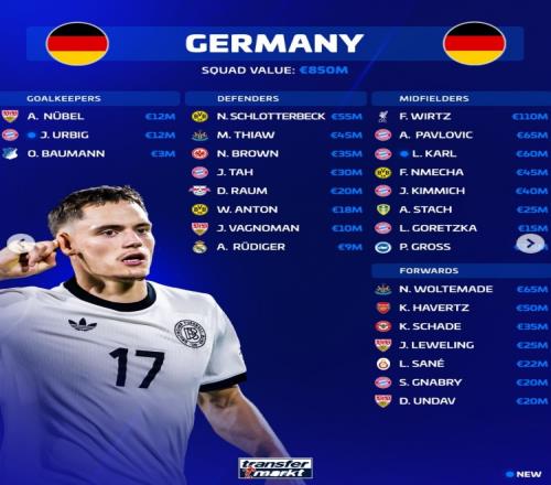德轉更新德國隊身價:維爾茨1.1億歐居首,卡爾6000萬歐隊內第三