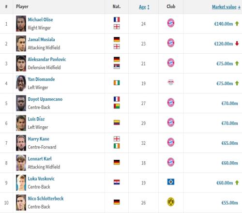 德甲最新身價(jià)前十(單位:歐元)