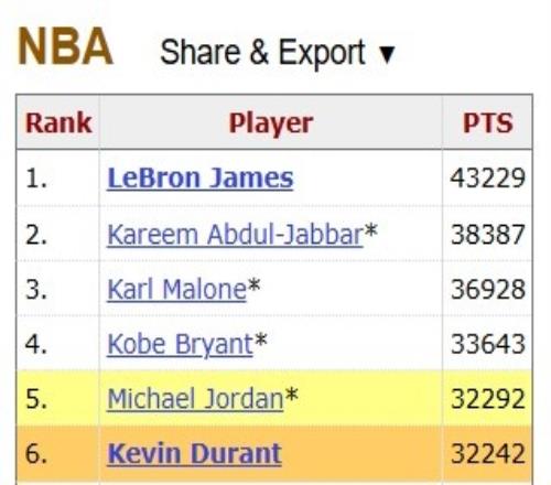 本場(chǎng)比賽過(guò)后,杜蘭特常規(guī)賽生涯得分達(dá)到32277,距離超越邁克爾·喬丹只差26分!