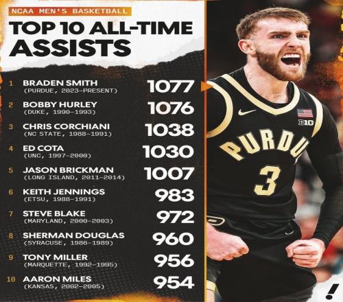 本場賽后,史密斯的總助攻數(shù)達(dá)到了1077次,超越了杜克大學(xué)球員鮑比·赫爾利,登頂NCAA歷史榜首。