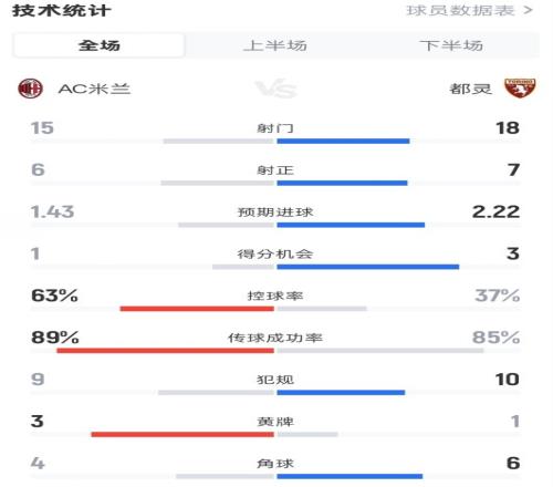 米蘭32都靈全場數據:射門1518,射正67,控球率63%37%