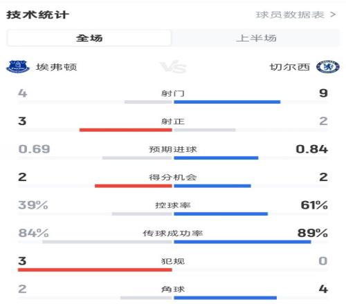 埃弗頓半場10切爾西數據:射門49,射正32,控球率39%61%