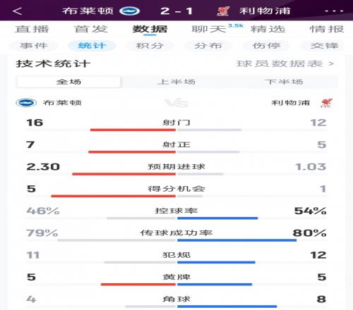 體育播報3月21日宣 在本輪英超,利物浦1-2不敵布萊頓,以下為雙方全場數據對比: