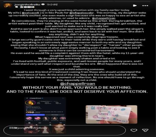 若日尼奧寫道:“今天早些時候,我和我的家人經歷了一件讓我無比憤怒的事。我的妻子帶著女兒在圣保羅參加音樂節(jié),只為了見見女兒心心念念的偶像查普爾·羅恩。