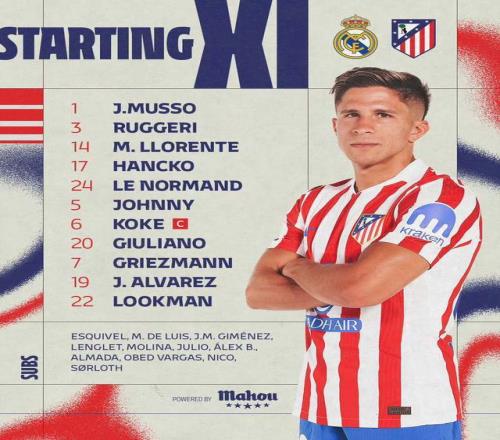 馬競同樣是標(biāo)準(zhǔn)的442,門將穆索。后防線:魯杰里、馬科斯·略倫特打兩個(gè)邊后衛(wèi),漢茨科、勒諾爾芒組成雙中衛(wèi)。前場:盧克曼、小西蒙尼打兩個(gè)邊前衛(wèi),隊(duì)長科克和卡多佐組成雙后腰。前鋒是格列茲曼和阿爾瓦雷斯。