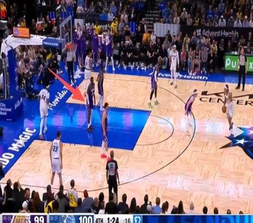 比賽還剩1分22秒,班凱羅弧頂持球單打里弗斯,該回合艾頓長時間站在油漆區上,并且停留時間超過3秒,本次回合應該吹罰防守三秒違例,魔術應該獲得一次罰球+球權!