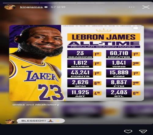 詹姆斯社媒轉發自己職業生涯多項歷史紀錄:心懷感恩