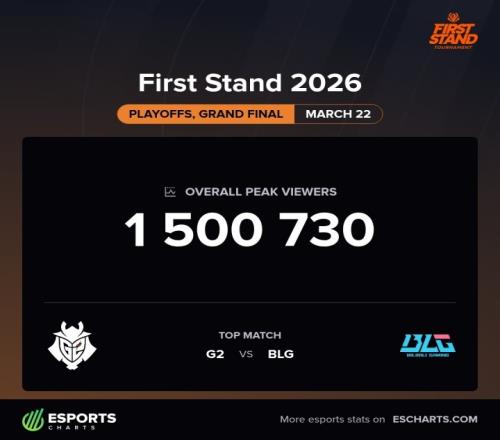 體育播報03月23日宣 來自EsportsCharts的數據顯示,BLG與G2的全球先鋒賽總決賽峰值觀眾超過150w,較去年決賽HLEvsKC有著顯著上漲。
