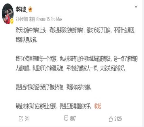 事后第二天,李祥波進行了回應,表示是“昨晚情緒上頭,沒有地域性起勢的想法,向魯吐布拉道歉”;